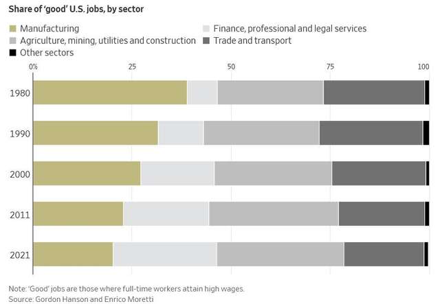 У своєму новому дослідженні Ґордон Генсон та Енріко Моретті виявили, що у 1980 році на обробну промисловість припадало 39% робочих місць у США, де працівники отримували високу заробітну плату (з урахуванням таких факторів, як освіта); до 2021 року цей показник знизився до 20%. За той самий період частка високооплачуваних робочих місць у фінансовій, професійній та юридичній галузях підскочила з 8% до 26%.