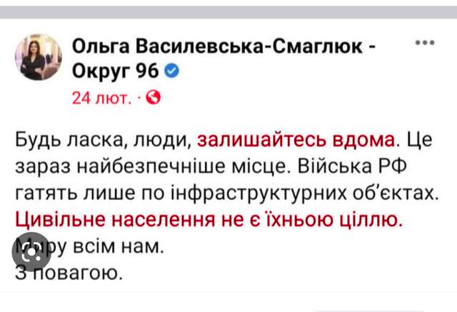 Як "Слуга не українського народу" Василевська-Смаглюк, обрана по округу в Бучі й Бородянці, 24 лютого закликала українців не евакуюватися