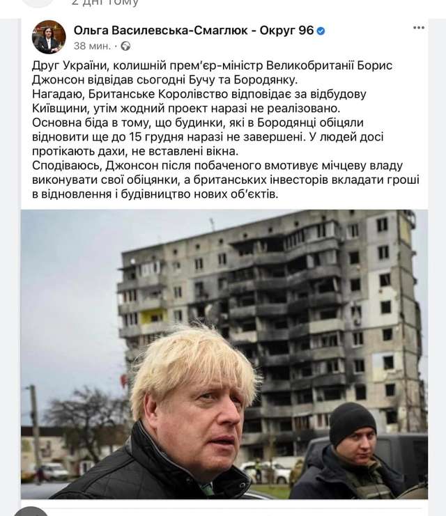 Замість того, щоб відстоювати інтереси мешканців свого округу, Василевська-Смаглюк звинувачує Великобританію в тому, що вона не відбудовує Бучу та Бородянку.