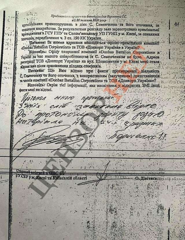 1. Звинувачення. Мене не підозрюють в шахрайстві. Мене підозрюють в створенні незареєстрованого, згідно з законодавством України воєнізованого формування. Борисенко - бреше, і його покази просто використовують для того, щоб хоч якось аргументувати звинувачення та кинути на мене тінь "шахрайства". Цю історію можна прирівняти до старих фейків про "афериста Семенченка", до речі, які вже давно спростовані в судах. ( На Вашому ж ресурсі є публікації про це). А його звинувачення краще коментувати матеріалами підозри. Показами його сина, фінансового директора компанії, через руки якого відбувались усі фінансові розрахунки та платежі.