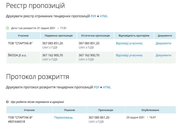 Ціна угоди лише на 0,02% нижча від очікуваної вартості закупівлі у 367,17 млн грн.