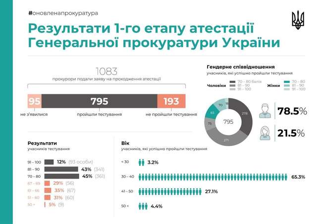 Якщо говорити в цифрах, на початок реформування Офісу генпрокурора на Різницькій працювали 1139 прокурорів, 1083 з них подали заяви на проходження атестації. 795 прокурорів її пройшли, 193 — не пройшли, 95 — не з’явилися на перше тестування.