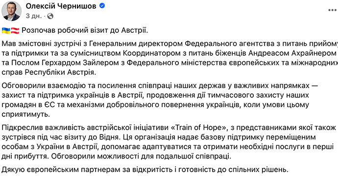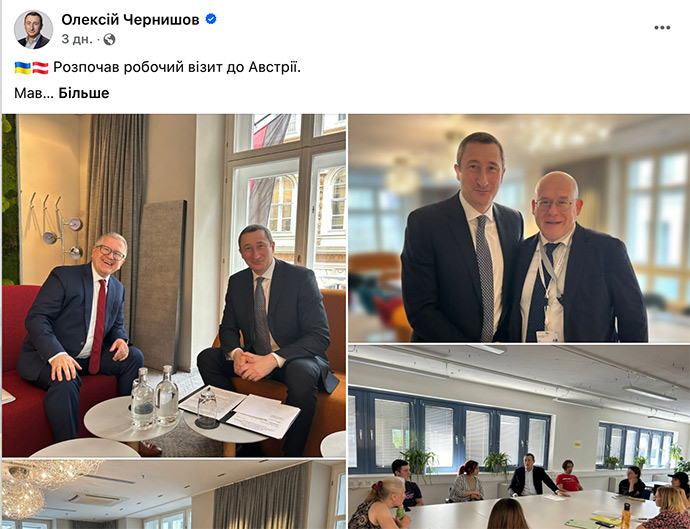 У понеділок Відень із офіційним візитом відвідав президент України. На жодному з фотозвітів із публічних заходів поруч із Зеленським не видно Чернишова – попри те, що віцепрем'єр також перебував у столиці Австрії з «робочим візитом». За інформацією джерел УП, Чернишов мешкав у тому ж готелі, що й офіційна українська делегація.
