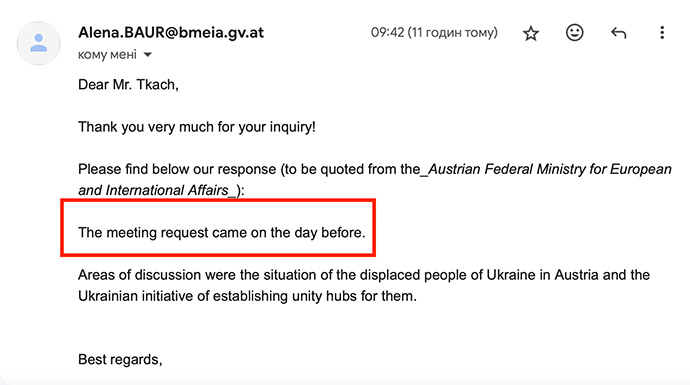 Редакція «Української правди» звернулась до всіх трьох організацій, з якими Чернишов мав зустрічі в австрійській столиці з питанням, коли саме представники міністра почали організацію цих зустрічей.