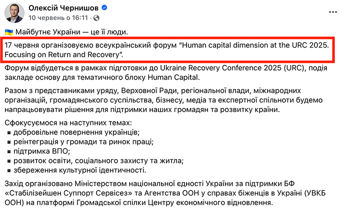 Принагідно нагадуємо, що перебіг робочих зустрічей віцепрем'єр-міністра, зокрема у закордонних відрядженнях, висвітлюється на офіційній сторінці Олексія Чернишова у Facebook та на офіційних ресурсах Міністерства національної єдності».
