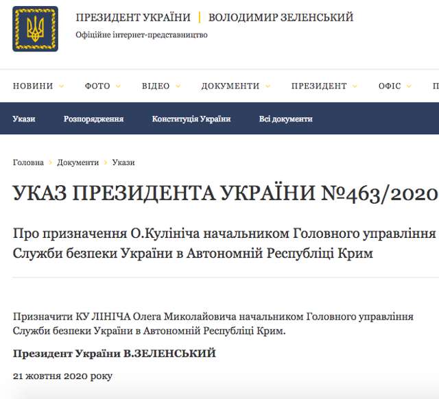 Водночас указ президента Володимира Зеленського щодо призначення Кулініча начальником кримського главку СБУ було підписано 21 жовтня 2020 року.