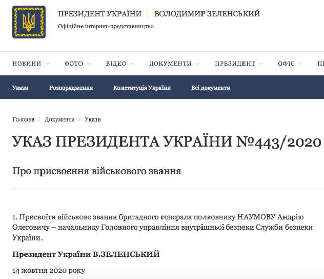 - 14.10.2020 президент України присвоїв полковнику А.Наумову військове звання бригадного генерала.