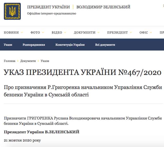 Хочемо зауважити, що Руслана Григоренка було призначено на посаду очільника СБУ Сумщини 20 жовтня 2020 року.