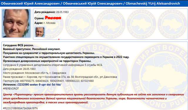 Як і обіцяли, починаємо розкривати агентуру 9 управління департаменту оперативної інформації (ДОІ) 5 Служби ФСБ рф, - повідомляє Центр "Миротвореь".