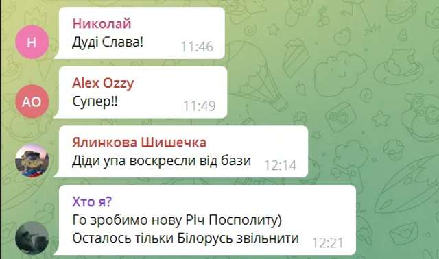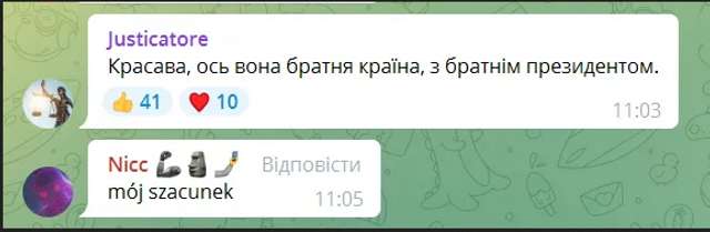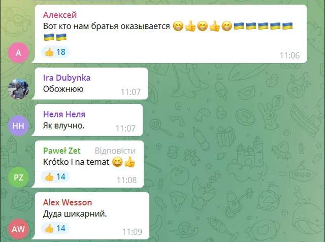 "Як влучно", "От хто нам брати, виявляється", "Дуда шикарний", "От вона, братня країна, з братнім президентом", "Зробимо нову Річ Посполиту. Залишилося тільки Білорусь звільнити", "Красень. Коротко і ясно", – пишуть вони під відео.