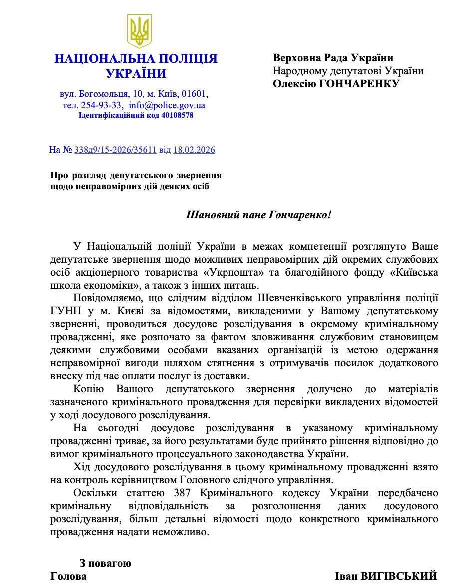 У листі від поліції зазначається, що у справі фігурують окремі службові особи акціонерного товариства «Укрпошта» та благодійного фонду «Київська школа економіки», йдеться про Тимофія Милованова та Ігоря Смілянського.