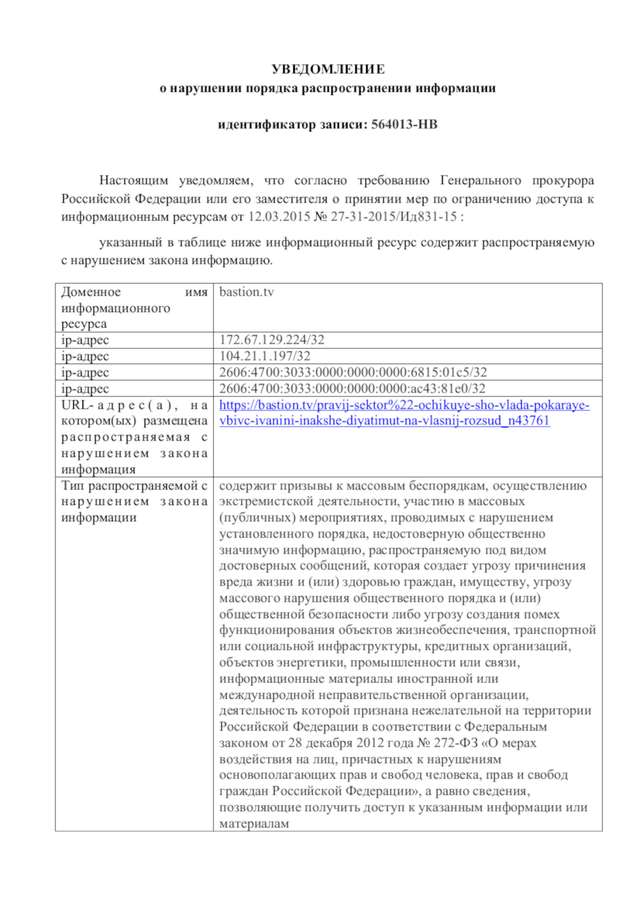 Сьогодні на електронну пошту "Останнього Бастіону" надійшли листи від "мосроскомнадзору", в яких від нас вимагається прибрати матеріали, присвячені діяльності НВР "Правого сектору".