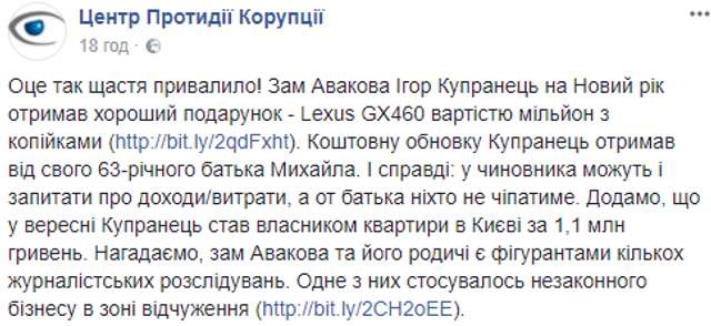 "Вот так счастье привалило! Заместитель Авакова Игорь Купранец на Новый год получил хороший подарок - Lexus GX460 стоимостью в миллион с копейками. Ценную обновку Купранець получил от своего 63-летнего отца Михаила. И действительно: у чиновника могут и спросить про доходы/расходы, а вот отца никто не тронет", - написали в сообществе.