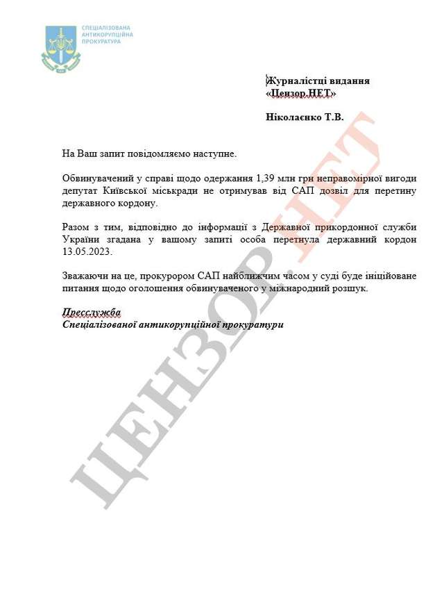 "Разом з тим, відповідно до інформації з Державної прикордонної служби України згадана у вашому запиті особа перетнула державний кордон 13.05.2023", - зазначили у САП.