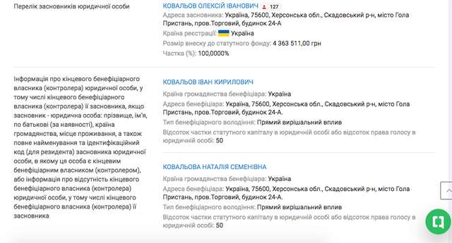 Кінцевими бенефіціарними власниками телеканалу, які «мають прямий вирішальний вплив», є Іван та Наталія Ковальови. Ймовірно, йдеться про батьків «слуги».