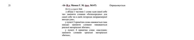 Як повідомляє Центр протидії корупції, мова йде про поправку до статті 364 Кримінального кодексу України (зловживання владою або службовим становищем).