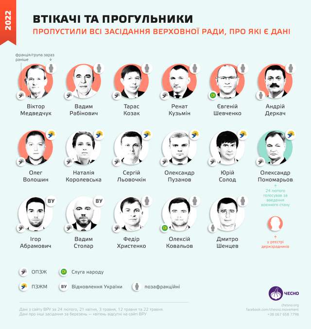 У роботі парламенту "депутат з проукраїнською позицією" участі не брав: за даними руху "Чесно", він пропустив всі засідання Ради під час повномасштабної війни, щодо яких є дані.