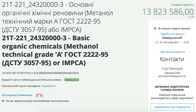 До кінця 2022 року для газопромислових управлінь замовника залізницею на умовах DAP мають поставити 14,7 тис. тонн технічного метанолу марки А за індикативною ціною 450 євро за тонну. Виробниками є російські АТ "Щокіноазот" і ПрАТ "Метафракс Кемікалс".