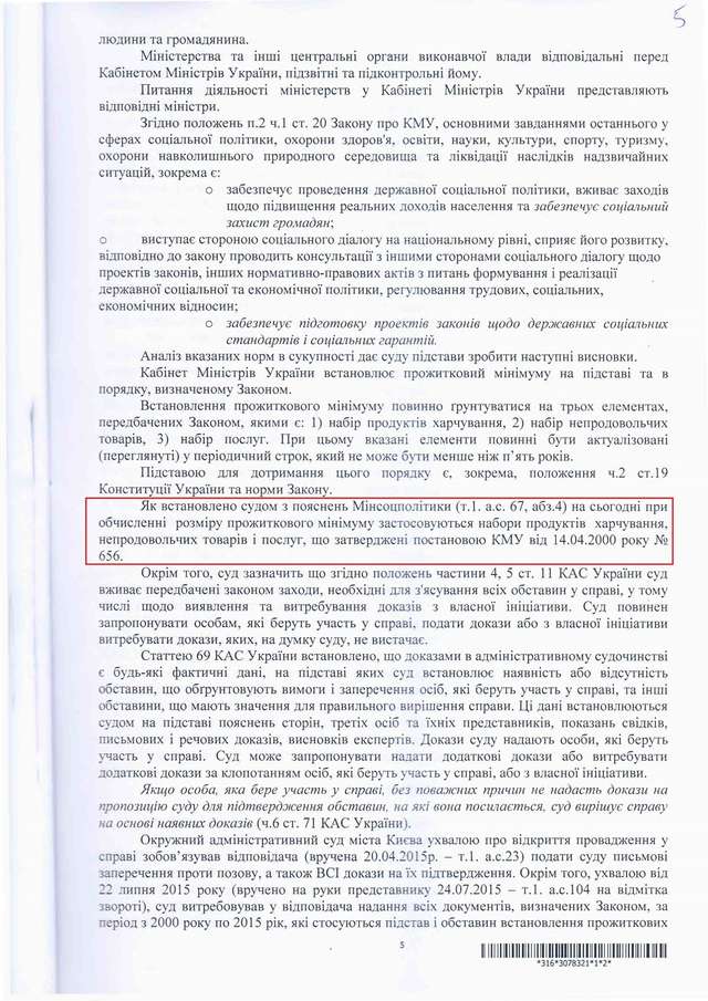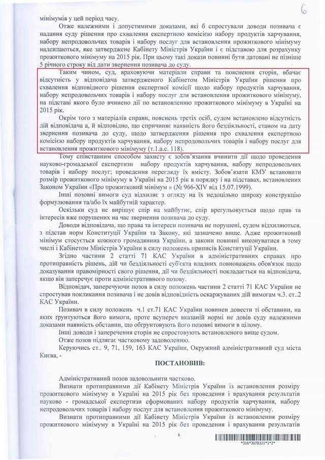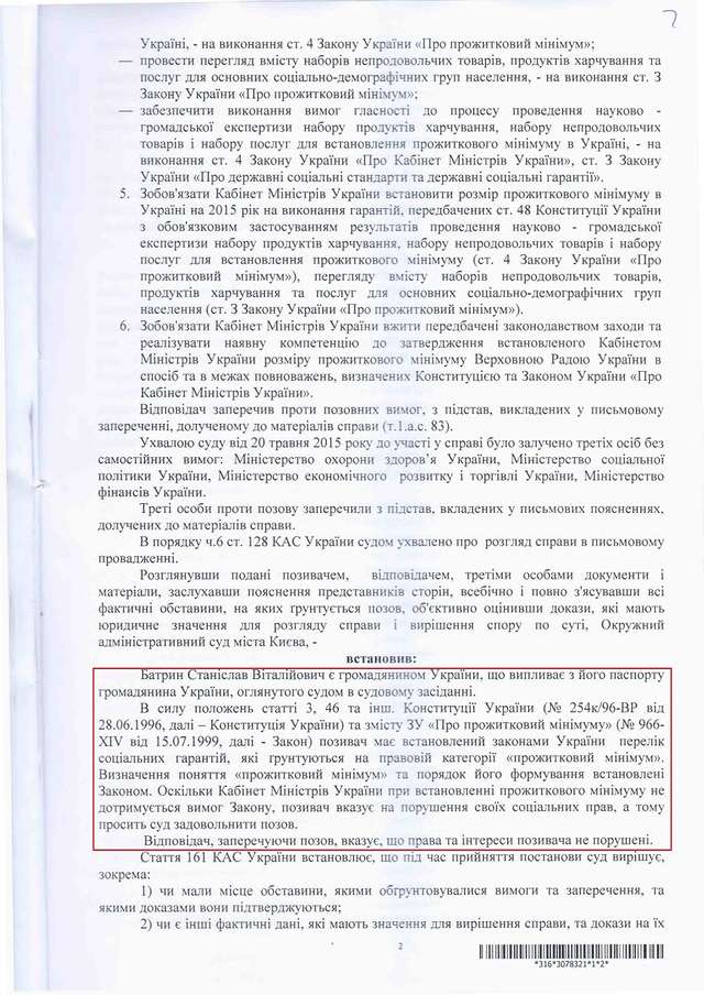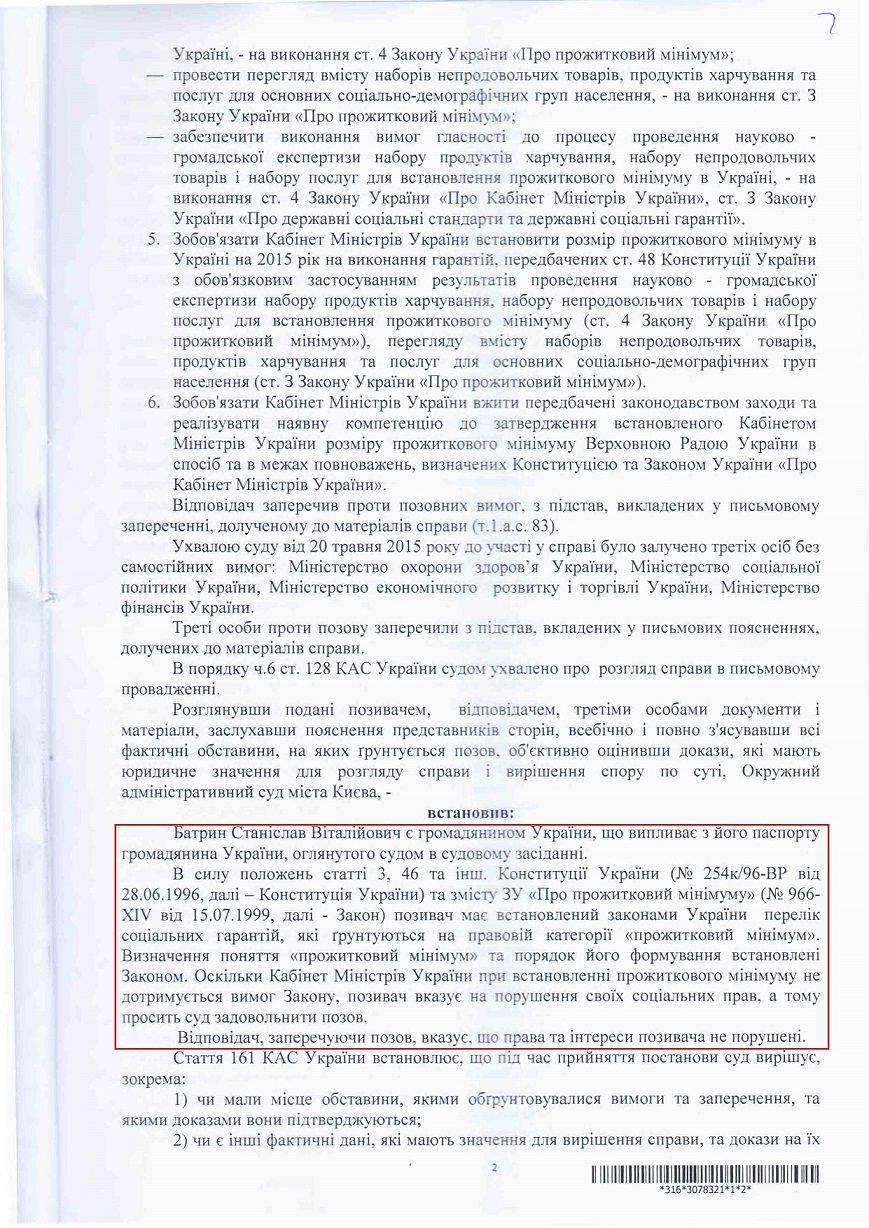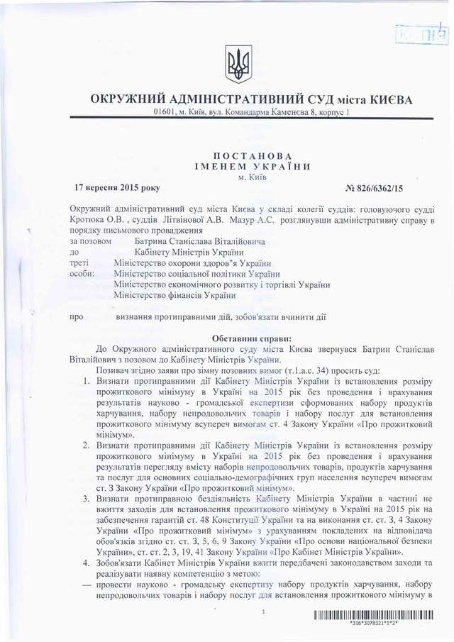 Як повідомлялося, 17 вересня 2015 року Окружний адміністративний суд міста Києва ухвалив рішення у справі за позовом правозахисника, керівника проекту "Відкритий Суд" Станіслава Батрина, яким було визнано дії уряду України протиправними та зобов'язано провести науково - громадську експертизу й переглянути розмір прожиткового мінімуму в Україні.