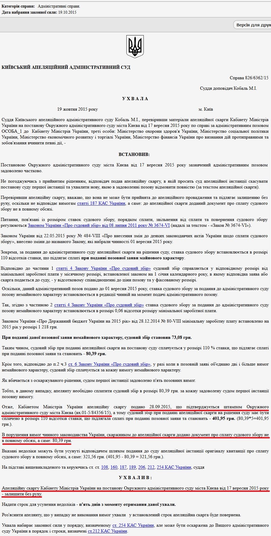Не зважаючи на це, уряд вдався до невиконання рішення суду та затягування процесу набуття рішенням чинності. При цьому, безпрецедентними виявилися засоби Кабінету Міністрів України: в реєстрі судових рішень було виявлено ухвалу апеляційного суду про залишення апеляційної скарги без руху, з якої вбачається, що уряд, оскаржив дане рішення і не доплатив судовий збір за подання скарги.