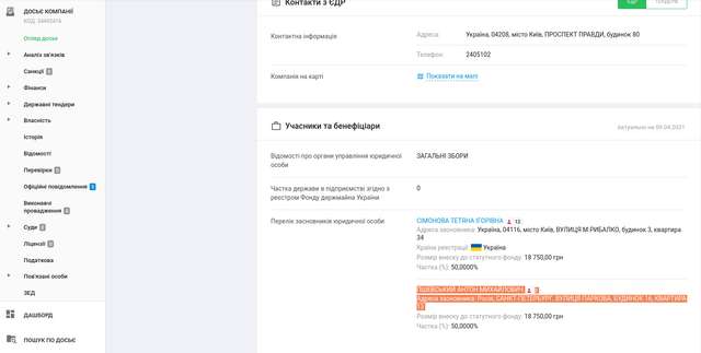 В ТОВ “Ленд Кепітал Інвестмент” Вадим Сімонов є керівником, а Тетяна Сімонова є співзасновницею. Другим співзасновником цього підприємства є громадянин РФ Антон Пшевський.