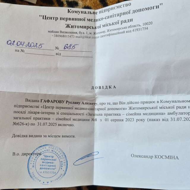 «19 травня 24-річний лікар-інтерн загальної практики — сімейної медицини Гафаров Руслан Алієвич, ішовши на роботу у Житомирський центр первинної медичної допомоги був примусово затриманий співробітниками ТЦК. Його силою доставили у Житомирський обласний ТЦК та СП попри те, що має законне відтермінування. Ми, — друзі та рідні, — відразу розпочали пошуки.