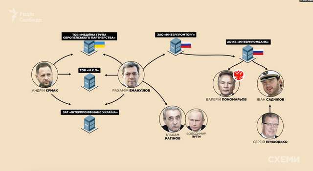 Бізнес-партнер Андрія Єрмака Рахамім Емануїлов через російський «Інтерпромбанк» має зв'язок із «єдиноросом» і сенатором Камчатки Пономарьовим, зятем першого заступника керівника апарату уряду росії Приходька, і через свою релігійну общину – із однокурсником президента росії володимира путіна.